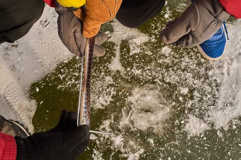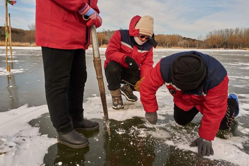 白洋淀人天生“懂水”,老家的人把這種經(jīng)驗稱為“懂凌水”。凌,就是冰。劉闖在冰面上走一圈,看一眼冰的顏色,聽一聽腳下的回聲,就知道這塊冰夠不夠結(jié)實。為了精準,“冰客”們每天三次測量冰的厚度,在冰場邊緣打孔,將尺子探下去,15厘米是安全線。