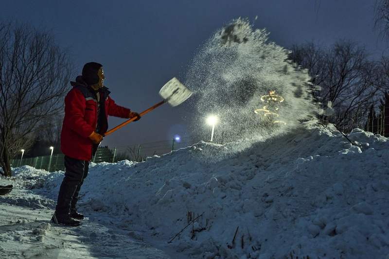 2026年1月18日,奧森公園冰場,一個工友正在清理積雪。