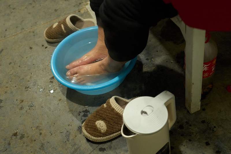 宿舍內(nèi),工友用熱水燙腳,舒緩身體的疲乏。