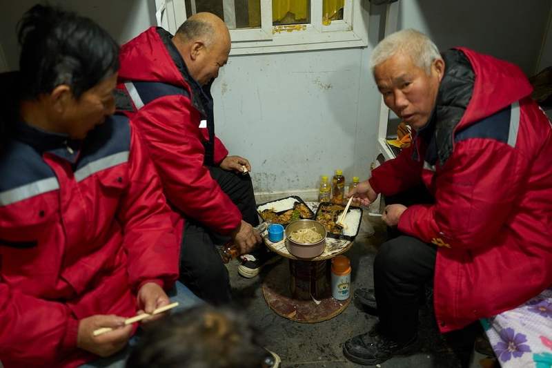 天氣寒冷,老板給工友們加了菜。年過六旬的張小林從床底下摸出一瓶10元錢買的燒酒,倒在杯蓋里,幾個工友聚在一起小酌起來,這是他們一天中不多的閑暇時光。