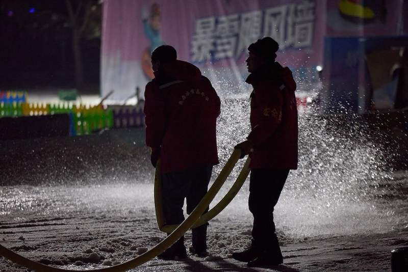 2026年1月16日23時,奧森公園雪場,工友們在進行灑水工作,使雪場更加堅實平整。