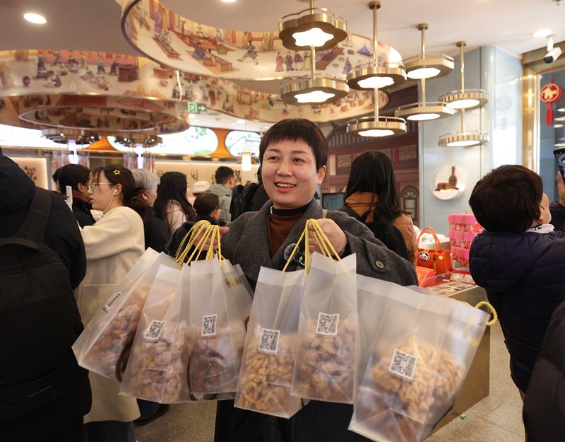 2月12日,隆福寺北京稻香村門(mén)店的年貨“三件套”——蜜三刀、奶油麻花和開(kāi)花棗,依舊是新春市集的“人氣王”,店內(nèi)擠滿(mǎn)了排隊(duì)購(gòu)買(mǎi)“三件套”的市民與游客,幾乎無(wú)處下腳。