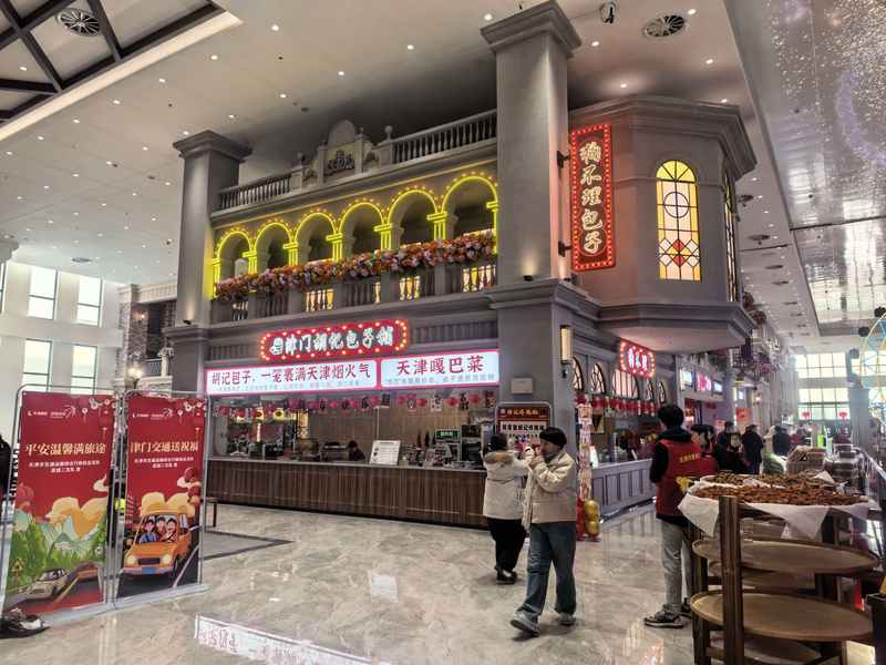 不僅有狗不理包子、桂發(fā)祥、泥人張等天津特色老字號品牌,還有肯德基、茶百道、庫迪咖啡等全國品牌。12元起售的煎餅果子、39元一位的自助餐檔口,一應(yīng)俱全。“煎餅每日可賣出數(shù)百套?!苯蛭秲杭屣炆虘魧π戮﹫?bào)貝殼財(cái)經(jīng)記者說,這就是天津本地的味道,顧客們吃著快捷方便。