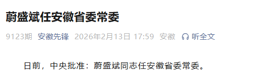 新京報(bào)訊 據(jù)安徽先鋒微信公眾號(hào)消息,日前,中央批準(zhǔn):蔚盛斌同志任安徽省委常委。編輯 辛婧 點(diǎn)贊 +1 微博 微信 我要評(píng)論 登錄 相關(guān)推薦 中央批準(zhǔn):蔚盛斌任安徽省委常委 政事兒 3.5萬 ?蔚盛斌任湖北省副省長 聽新聞 6573 ?蔚盛斌任湖北省副省長 政事兒 4.2萬 蔚盛斌任湖北省副省長 第一看點(diǎn) 直播 預(yù)告 大年初二逛廟會(huì)!沉浸式感受市井煙火與長城年味 2026-02-18 09:30 熱點(diǎn) 1 新春走基層|吃39元自助、逛騎行館,王慶坨服務(wù)區(qū)變“潮”了 11.0萬 2 視頻|對(duì)話救人英雄欒留偉的妻子:北京人局氣,我收到了很多祝福 4.2萬 3 日本稱扣押一中國漁船及其船長 外交部回應(yīng) 4.0萬 4 Seedance2.0全球“出圈”:AI生成視頻,中美“攻守易形” 4.0萬 5 中央批準(zhǔn):蔚盛斌任安徽省委常委 3.4萬 最新 機(jī)器人進(jìn)場(chǎng)、巨幕就位!海淀新春科技廟會(huì)先睹為快 29分鐘前 國際|特朗普稱以總統(tǒng)應(yīng)為不赦免以總理“感到羞愧” 以總統(tǒng)回應(yīng) 44分鐘前 居民陽臺(tái)火情初露苗頭,微型站消防員巡邏時(shí)發(fā)現(xiàn)及時(shí)撲救 1小時(shí)前 北京警方開展安全隱患集中整治 1小時(shí)前 東城警方節(jié)前全面排查護(hù)平安,引導(dǎo)商戶和群眾增強(qiáng)安全意識(shí) 1小時(shí)前 熱議 總書記考察回訪|智源林詠華:人才挑大梁,打造一支AI“北京隊(duì)” 2026新春走基層 | 北京西站給水員的春運(yùn)“半馬” 2026新春走基層|3.5萬步的堅(jiān)守:高鐵上水工的隱形守護(hù) 中國科學(xué)院“打假”,讓“蹭名頭”現(xiàn)原形 | 新京報(bào)快評(píng) 總書記視察的這條胡同里,藏著哪些北京社區(qū)養(yǎng)老密碼|新京報(bào)專欄