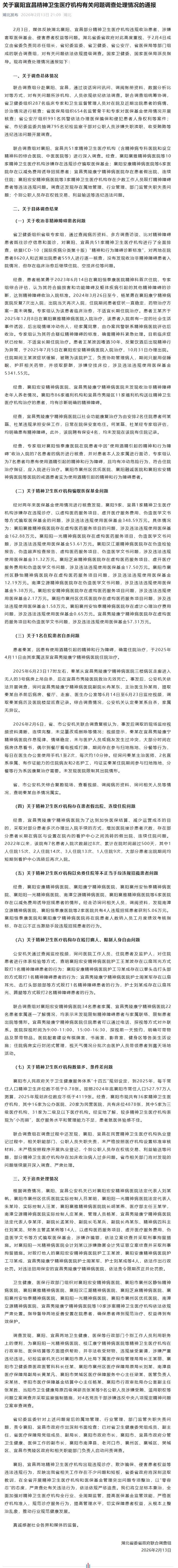 衛(wèi)生健康、醫(yī)保行政部門組織對襄陽宏安精神病醫(yī)院、襄陽市襄州區(qū)靜怡精神病醫(yī)院、襄陽襄雅精神病醫(yī)院、襄陽漢江潮精神病醫(yī)院、襄陽芝麻精神病醫(yī)院、襄陽襄州安怡泰精神病醫(yī)院、襄陽陽一光精神病醫(yī)院、襄陽市襄州區(qū)優(yōu)撫醫(yī)院、南漳立源精神病醫(yī)院、宜昌夷陵康寧精神病醫(yī)院等10家涉案精神衛(wèi)生醫(yī)療機構依法依規(guī)嚴肅處置。指導督導兩地妥善安置在院患者,確?;颊叩玫揭?guī)范治療、權益得到有效保護。