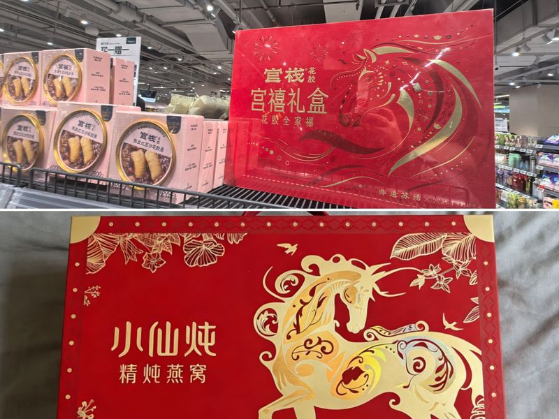 春節(jié)的腳步越來越近,北京市朝陽區(qū)一家盒馬門店內(nèi)的人流比平日多了不少。晚上9時,店內(nèi)專推滋補養(yǎng)生品的“盒補補”專區(qū),仍不時有顧客駐足挑選。一對年輕夫婦在滿是滋補品年貨禮盒的堆頭前小聲討論,“過年要不拎一盒燕窩,現(xiàn)在挺流行的”,“或者買點阿膠,咱和媽都能吃,還補氣血”。