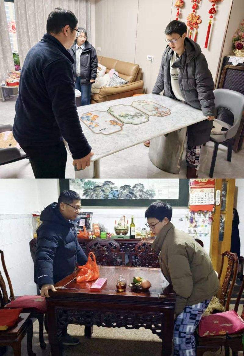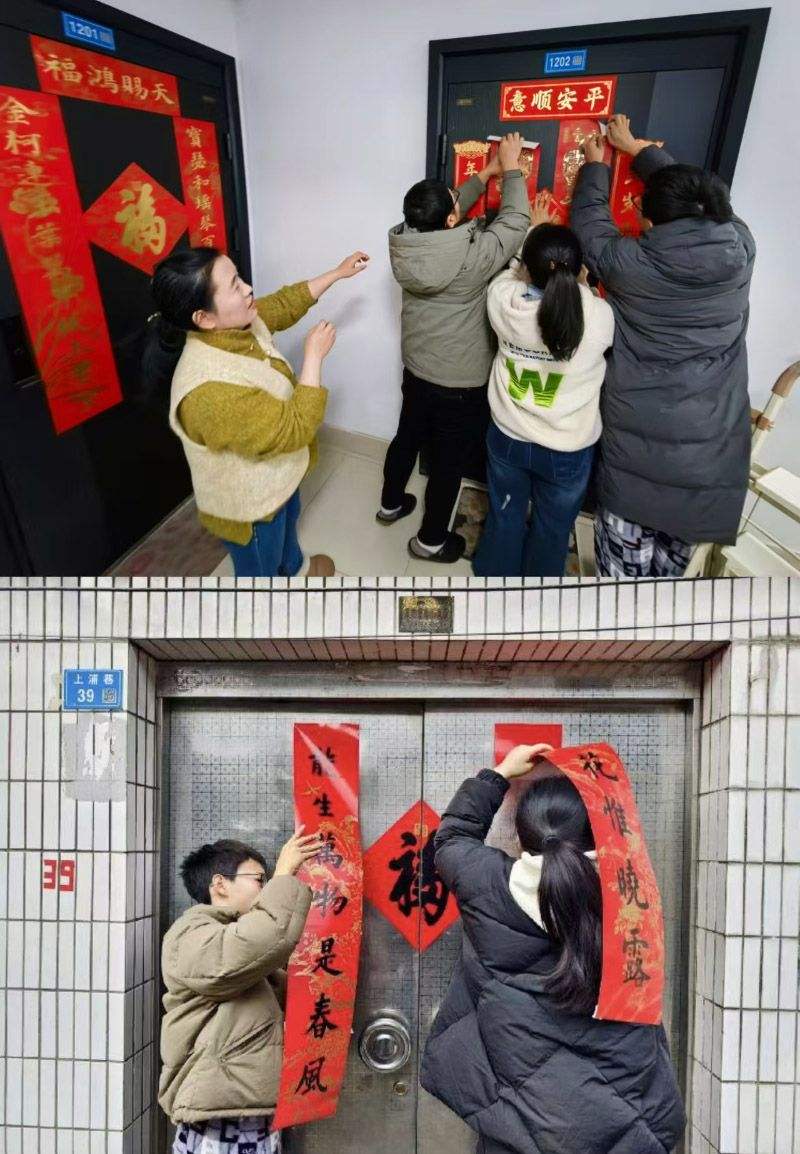 (上圖)2026年2月16日,除夕,江蘇無錫新吳區(qū)旺莊街道新光嘉園,從北京回老家過年的浦暄晨,與家人一同為相鄰的爺爺家和大伯家張貼春聯(lián)。當(dāng)天,家中舉行祭祖儀式。(下圖)2024年2月9日,除夕,浦暄晨和堂姐浦靜羽最后一次在老宅貼春聯(lián)。