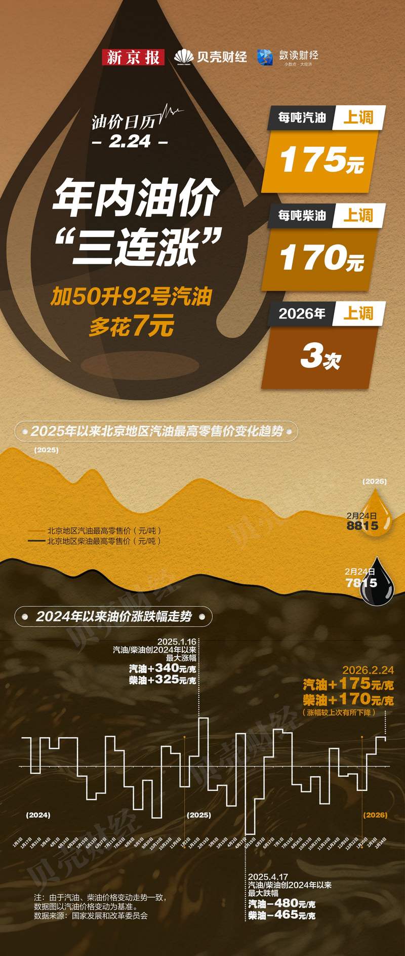 據(jù)國家發(fā)展改革委消息,自2月24日24時起,國內(nèi)汽、柴油價格(標(biāo)準(zhǔn)品)每噸分別上漲175元和170元,折合成升價,每升92號汽油、95號汽油和0號柴油的升幅分別在0.14元、0.15元、0.14元。2026年成品油調(diào)價呈現(xiàn)“三漲零跌一擱淺”的格局,國內(nèi)成品油零售價格迎來“三連漲”,本輪是今年第四次調(diào)價,也是第三次上調(diào)。今年國內(nèi)汽、柴油價格每噸累計上漲465元和450元。北京地區(qū)汽油最高零售價8815元/噸,柴油7815元/噸。