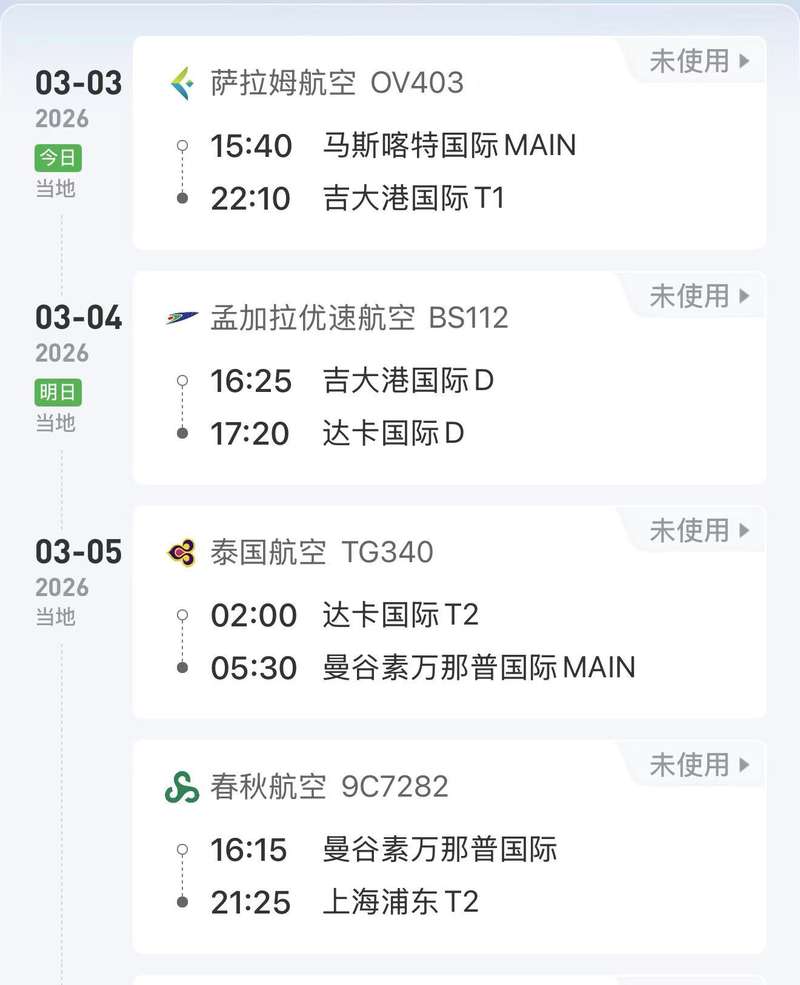 但最怕突如其來(lái)的變故。3月2日,鄧野收到通知,飛往孟買的航班不知為何被取消,她不得不重新規(guī)劃路線。最終,她又購(gòu)買了3月3日由阿曼飛往印度達(dá)卡的航班。