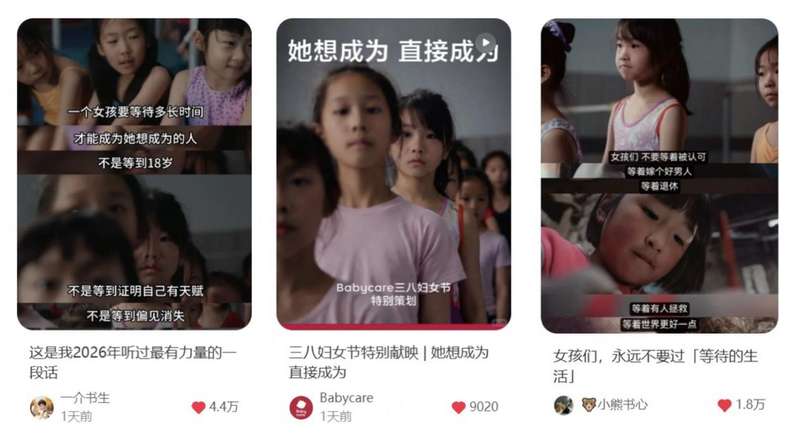3月5日,Babycare全網(wǎng)上線#她想成為直接成為#品牌公益片與金句海報(bào),一經(jīng)發(fā)布便引起共鳴?!耙粋€(gè)女孩要等待多長(zhǎng)時(shí)間,才能成為她想成為的人?”片中的這句話,直擊無數(shù)女性內(nèi)心。