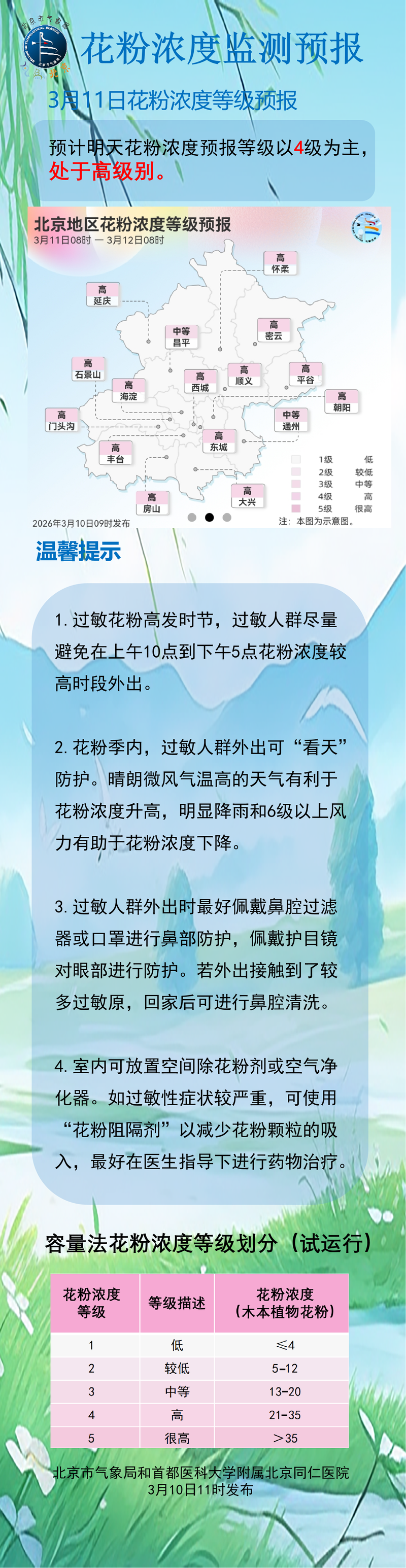 新京報訊 3月10日,北京市氣象局發(fā)布花粉濃度監(jiān)測預報,預計3月11日北京市花粉濃度以4級為主,處于高級別。編輯 陳艷婷 點贊 +1 微博 微信 我要評論 登錄 相關推薦 預計5月18日北京市花粉濃度以4級為主,處于高級別 第一看點 5790 預計5月17日北京市花粉濃度以4級為主 處于高級別 北京快聞 6729 預計5月16日北京市花粉濃度以4級為主,處于高級別 第一看點 預計5月14日北京市花粉濃度以4級為主,處于高級別 第一看點 1.2萬 預計5月13日北京市花粉濃度以5級為主,處于很高級別 第一看點 7218 熱點 1 “中傳砍掉16個本科專業(yè)”?廖祥忠回應:“不必驚慌” 11.5萬 2 提“盡量不要調(diào)休”的人大代表田軒:休假不只休息,更是發(fā)展底氣 7.7萬 3 十四屆全國人大四次會議第二場“部長通道”集中采訪活動舉行 3.5萬 4 一只“龍蝦”攪動江湖:國產(chǎn)大模型廠商“吃撐”,大廠急了 3.4萬 5 Babycare鼓勵女性“直接成為”,全民共創(chuàng)刷屏戳中了誰? 3.3萬 最新 李鵬程出任大眾安徽首席營銷官 5分鐘前 啟境首款車型定名為啟境GT7,3月17日將發(fā)布 16分鐘前 嵐圖夢想家第20萬輛整車下線 21分鐘前 “具身大腦”企業(yè)靈初智能完成20億元融資 31分鐘前 魔法原子完成新一輪5億元融資,同步啟動百億級具身智能產(chǎn)業(yè)基金 31分鐘前 熱議 綿陽一采砂場有鳥類在砂堆筑巢 官方:系保護動物 區(qū)域已停工 兩會聲音丨孫光芝:建議修訂《旅游法》,以法治護航旅游強國建設 斬斷違禁境外影視劇傳播鏈,應像治理黃色網(wǎng)站一樣治理違規(guī)平臺 速覽 | 2026年最高檢工作報告亮點內(nèi)容來了 “養(yǎng)龍蝦”刷屏,“算電協(xié)同”一波大漲