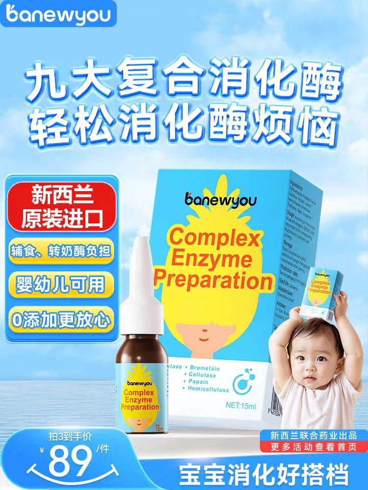 在某平臺伴樂優(yōu)旗艦店,一款“伴樂優(yōu)”復(fù)合消化酶在商品頁面宣稱,缺少消化酶會導(dǎo)致食物酶解不充分,營養(yǎng)吸收不全面,并列舉了寶寶厭食挑食、消化吸收差、發(fā)育遲緩、不愛睡覺等嬰幼兒“腸胃不好”的場景。稱其產(chǎn)品添加了9大消化酶,嬰幼兒如有積食、便秘等情況,可在餐后兌入溫水服用,也可以加入奶液、輔食中食用。