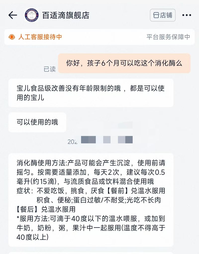 百適滴旗艦店客服稱其消化酶食用無年齡限制。 電商截圖