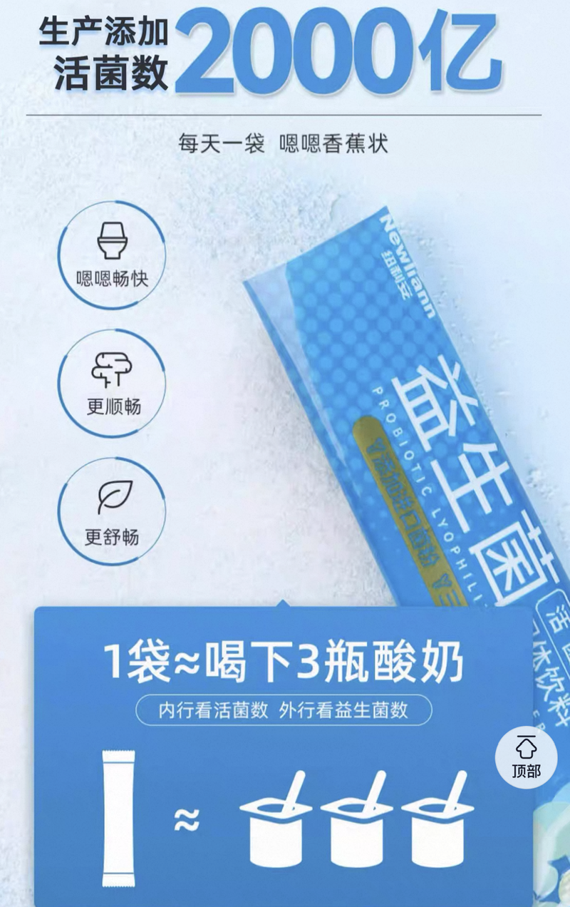 在宣稱功效的同時(shí),一些普通食品類益生菌還會(huì)隱秘地使用“嗯嗯”暗示“便秘”。如newliann紐立安旗艦店,在紐立安益生菌凍干粉固體飲料(2000億CFU/盒)產(chǎn)品詳情頁(yè)提及“每天一袋,嗯嗯香蕉狀”“嗯嗯暢快”“株株逐一擊破腸道問(wèn)題”。同時(shí),在該頁(yè)面用小字備注“本頁(yè)面相關(guān)數(shù)據(jù)來(lái)源于網(wǎng)絡(luò)及資料查詢,部分內(nèi)容為科普知識(shí),僅供消費(fèi)者參考學(xué)習(xí),相關(guān)內(nèi)容不代表產(chǎn)品功效,請(qǐng)理性閱讀消費(fèi)”。