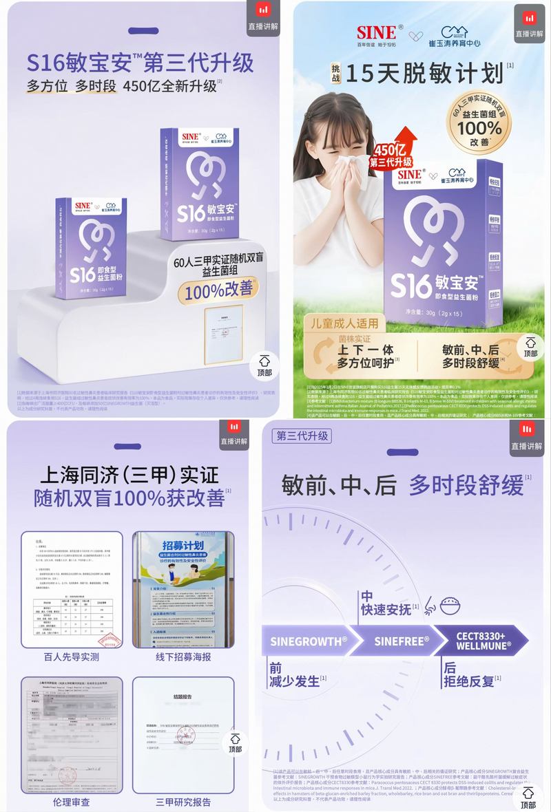 眾多益生菌產(chǎn)品中,也有開(kāi)展了臨床研究的產(chǎn)品。如信誼官方旗艦店在S16敏寶安即食型益生菌粉的產(chǎn)品詳情頁(yè),提到了上海同濟(jì)醫(yī)院主導(dǎo)的《S16敏寶安即食型益生菌粉對(duì)過(guò)敏性鼻炎患者診療的有效性及安全性評(píng)價(jià)研究》,研究結(jié)論為連續(xù)4周使用S16,益生菌組患者癥狀改善有效率為100%。店內(nèi)據(jù)此以“60人三甲實(shí)證隨機(jī)雙盲益生菌組 100%改善”放大文字宣傳,下方還用小字提到“該產(chǎn)品核心成分具有敏前、中、后相關(guān)的循證研究?!睆漠a(chǎn)品屬性來(lái)看,該產(chǎn)品為即食型益生菌粉(乳酸菌類),依然屬于普通食品。商家也用非常小的字提醒:“本品為食品,實(shí)際效果存在個(gè)人差異,僅供參考”。