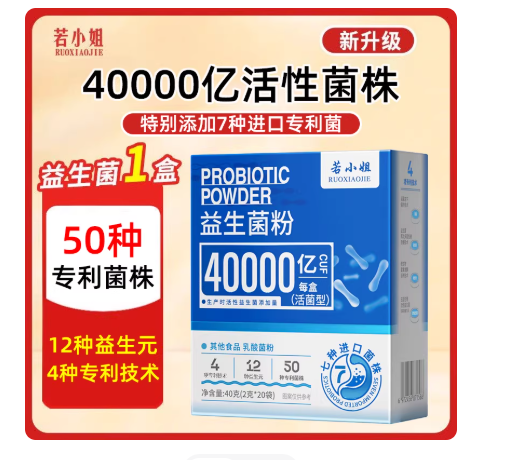 若小姐旗艦店所售的若小姐益生菌粉(40000億CFU/盒)中,宣稱一盒添加50種專利菌種。店鋪截圖。