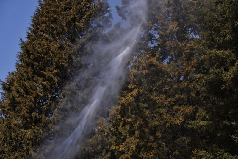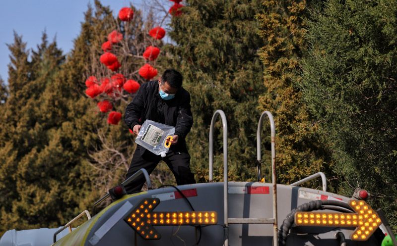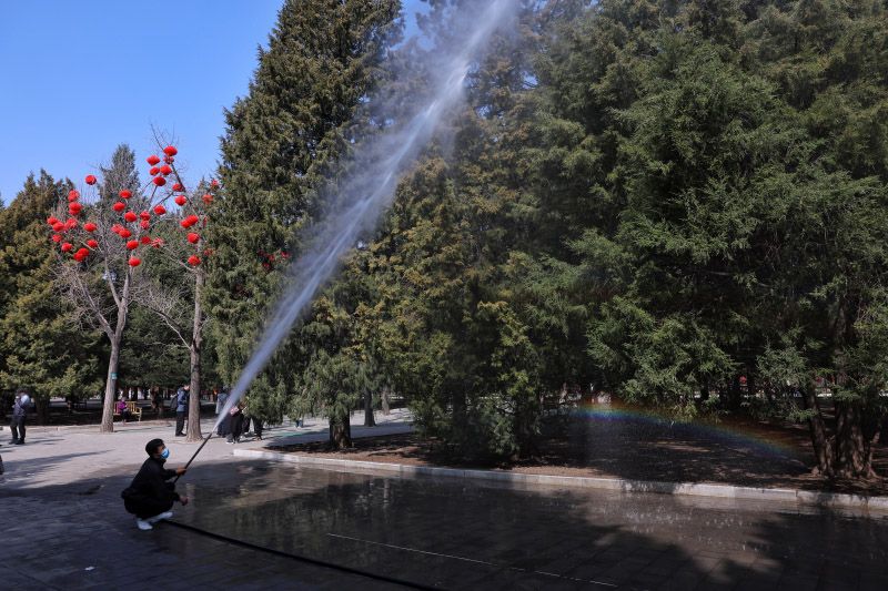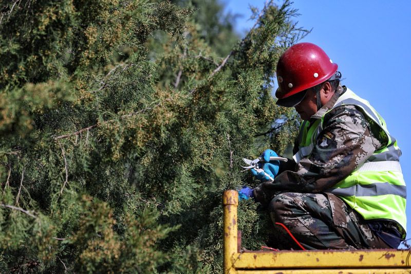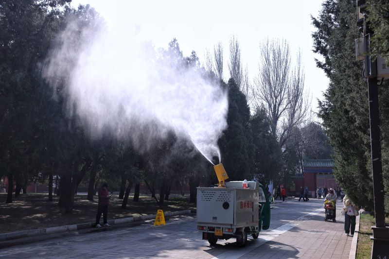 3月15日,地壇公園,工作人員往圓柏上噴灑花粉固定劑。北京春季致敏花粉散粉期為3月上旬至4月下旬,主要致敏原為柏科、楊柳科、榆科等植物,其中,柏科花粉長期居致敏花粉首位。目前,北京已經(jīng)繪制形成“五環(huán)內(nèi)圓柏密度空間分布圖”,為防控作業(yè)提供精準(zhǔn)的空間導(dǎo)航。