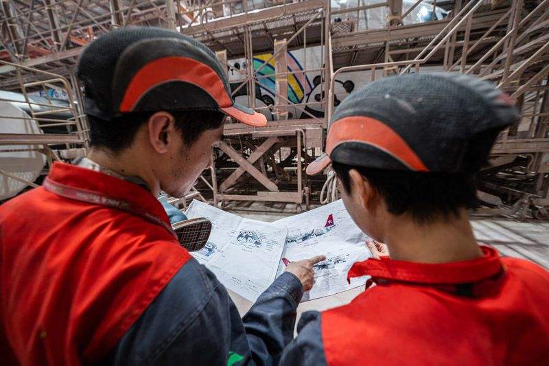 一位資深技師手中的噴槍沿著熊貓“得得”的眼睛邊緣緩緩移動,漆霧細(xì)膩均勻地附著在蒙皮上,黑白交界處呈現(xiàn)出柔和的漸變。另一位工程師則站在平臺上,專注地為“加加”身上的毛發(fā)添加層次感——黑色中透出些許深灰,讓熊貓形象愈發(fā)栩栩如生。整個機(jī)庫內(nèi)彌漫著淡淡的漆料氣味,伴隨噴槍發(fā)出的“嘶嘶”聲,仿佛一曲工業(yè)與藝術(shù)交織的樂章。