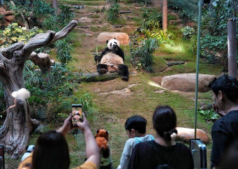 香港海洋公園內(nèi),游客參觀大熊貓“可可”。