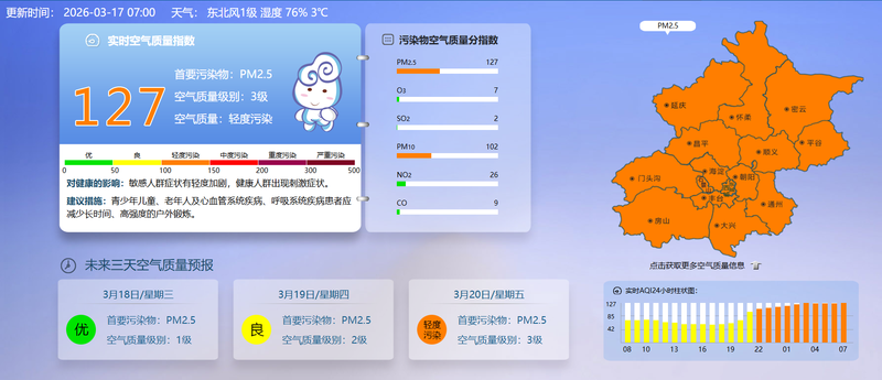據(jù)北京市生態(tài)環(huán)境監(jiān)測中心今早7時數(shù)據(jù),目前實時空氣質(zhì)量指數(shù)127,空氣質(zhì)量輕度污染。