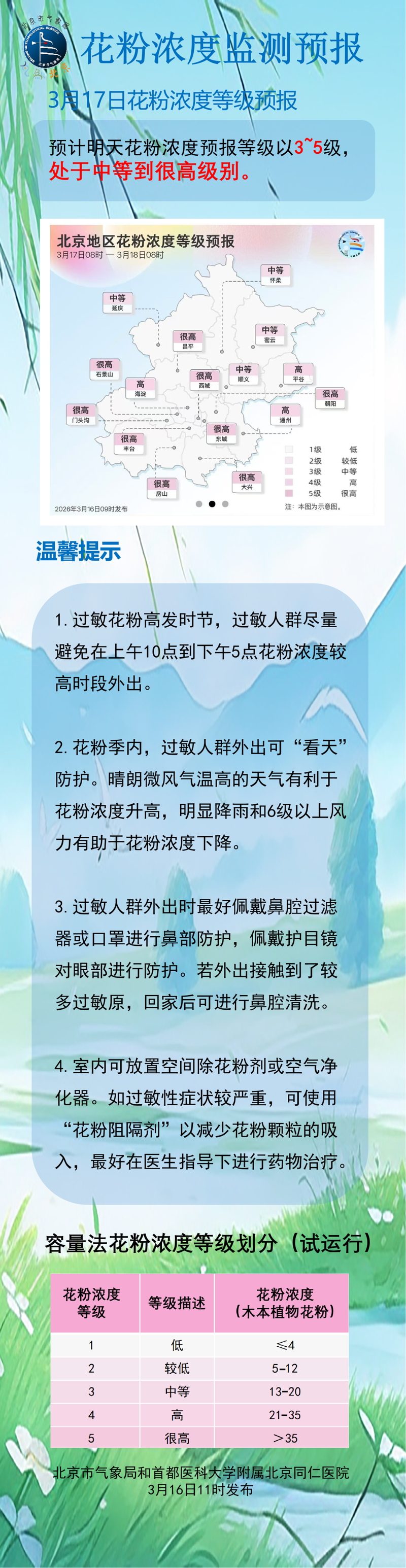 近期北京致敏花粉濃度達到高水平,易敏人群請做好健康防護,外出活動盡量避開10:00至17:00花粉濃度較高時段?;丶液蠹皶r清洗鼻腔,更換外衣。詳情>>>