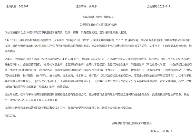 多氟多表示,經(jīng)公司核查,河南億豐電子新材料有限公司未與媒體報(bào)道的四川省蜀福香食品有限責(zé)任公司、重慶市曾巧食品有限公司等建立任何形式的業(yè)務(wù)合作、品牌授權(quán)或產(chǎn)品生產(chǎn)關(guān)系,其生產(chǎn)、銷(xiāo)售行為與公司及控股子公司無(wú)任何關(guān)聯(lián)。
