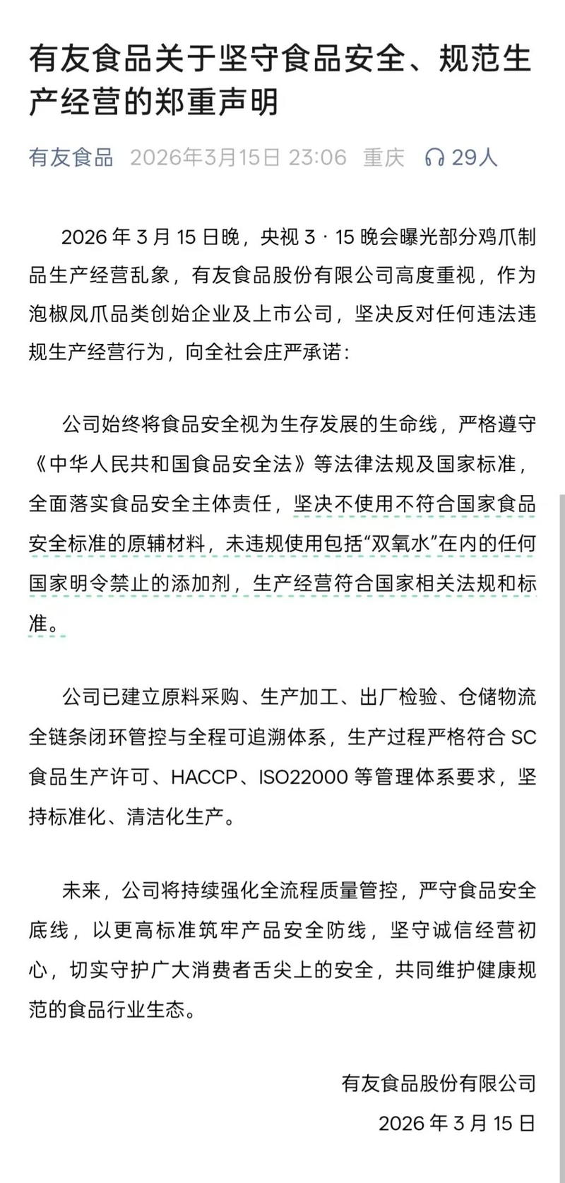 央視點(diǎn)名“漂白雞爪”,有友食品、王小鹵發(fā)聲