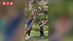 記者在十里堡、薊門橋等賞花點看到,有的游客為了站得更高、拍得更全,直接踩在桃樹的分叉處,雙手抓著樹枝搖晃,導致不少細小的樹枝被折斷;還有游客隨手采摘桃花,插在頭發(fā)上或裝進口袋,甚至有家長帶著孩子一起拉扯花枝。