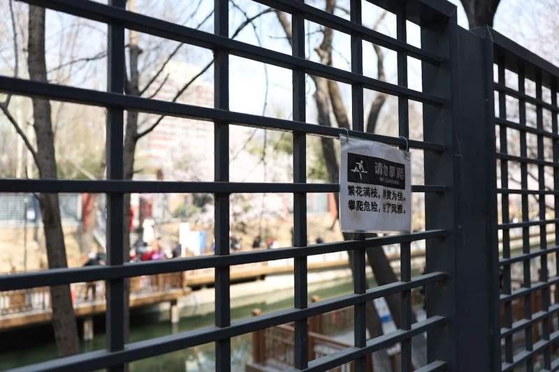 3月17日,安定門西濱河路北護城河岸邊,游客站在沒有安全設施的臨水位置,手抓桃花樹枝進行拍攝。