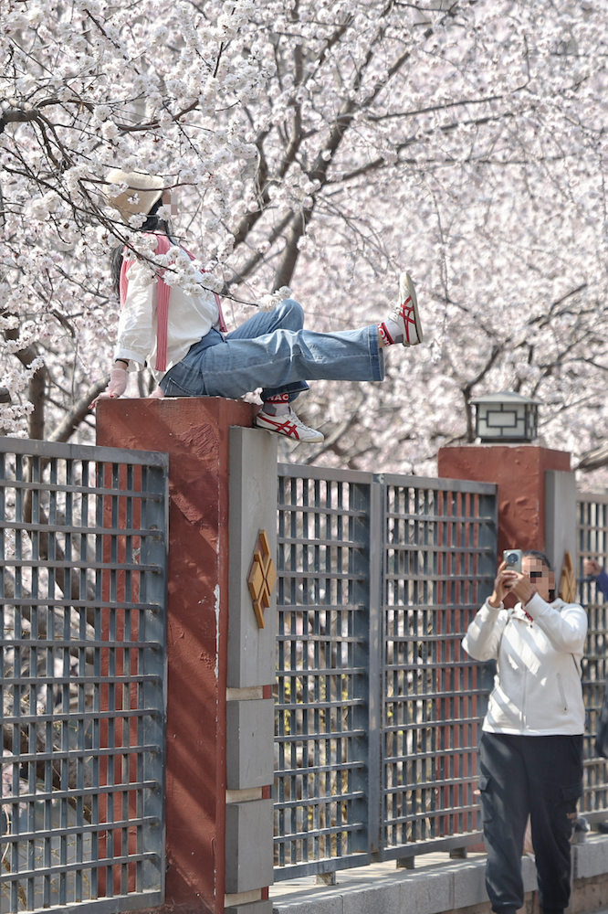3月16日,左安門角樓對岸,市民為了拍攝桃花與角樓同框,進入護欄外側的臺階拍照,拍攝者正在側身過人。