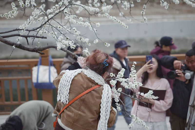 水域周邊的賞花點,危險系數則更高。3月17日上午,記者在安定門西濱河路附近的岸邊看到,這片區(qū)域種植著大片山桃,有部分游客為了拍攝“花與水”的同框畫面,徑自走到岸邊,一手抓著山桃花枝維持平衡,一手擺造型拍照,有的甚至讓同行者站在身后,用力拉扯樹枝調整角度,致花瓣散落一地。