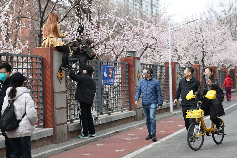 3月14日9點,記者在朝陽區(qū)十里堡賞花點觀察到,僅1小時,就有7名游客先后爬上圍墻擺拍,其中既有年輕情侶,也有帶娃的家長。
