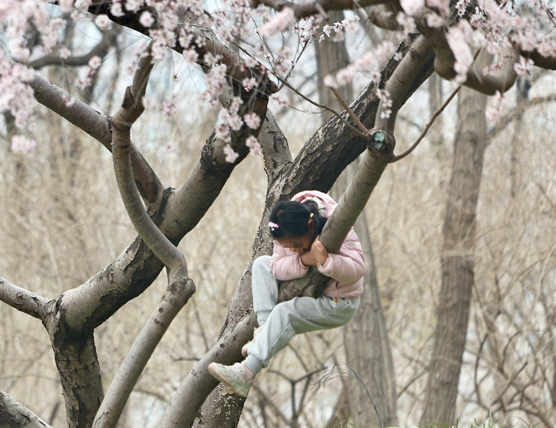 3月17日,薊門橋地鐵E口附近,小朋友爬上樹讓攝影師拍攝照片。