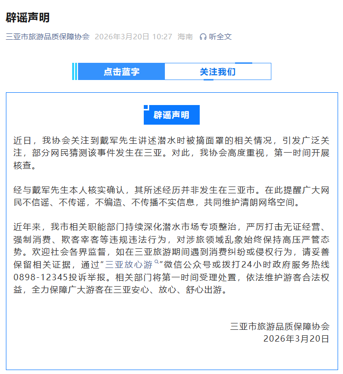 新京報訊 3月20日,三亞市旅游品質(zhì)保障協(xié)會發(fā)布辟謠聲明,內(nèi)容如下: